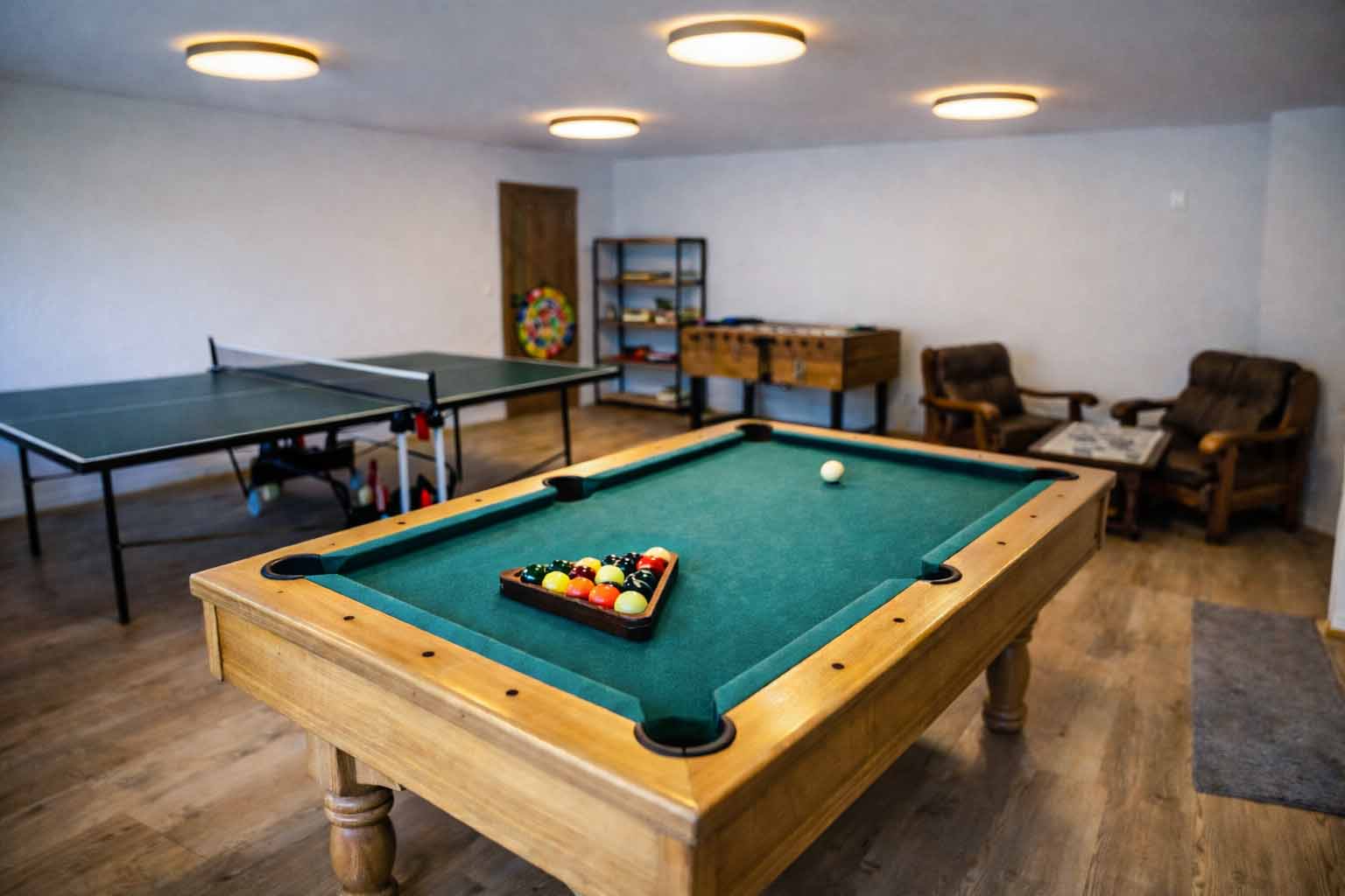 Na poschodí sa nachádza samostatná miestnosť so spoločenskými hrami, ako je biliard, stolný tenis či stolný futbal. Tento priestor je súčasťou prenájmu a je hosťom k dispozícii počas celého pobytu na oddych a zábavu.